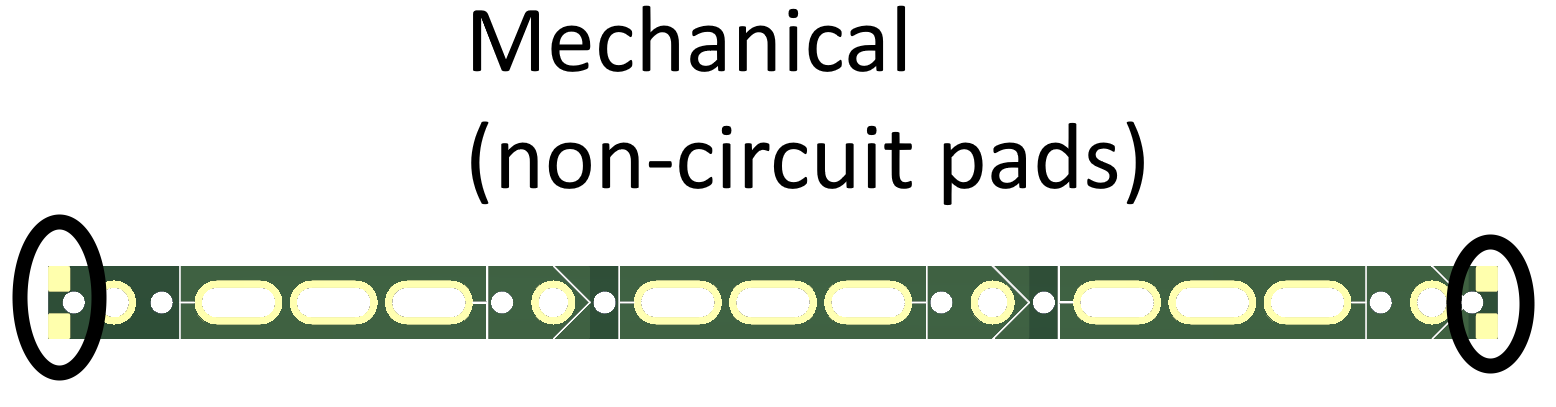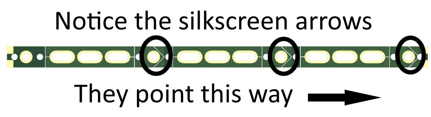Note -- The PCB arrows point to the plated circle at the end of each 3-cell jig.