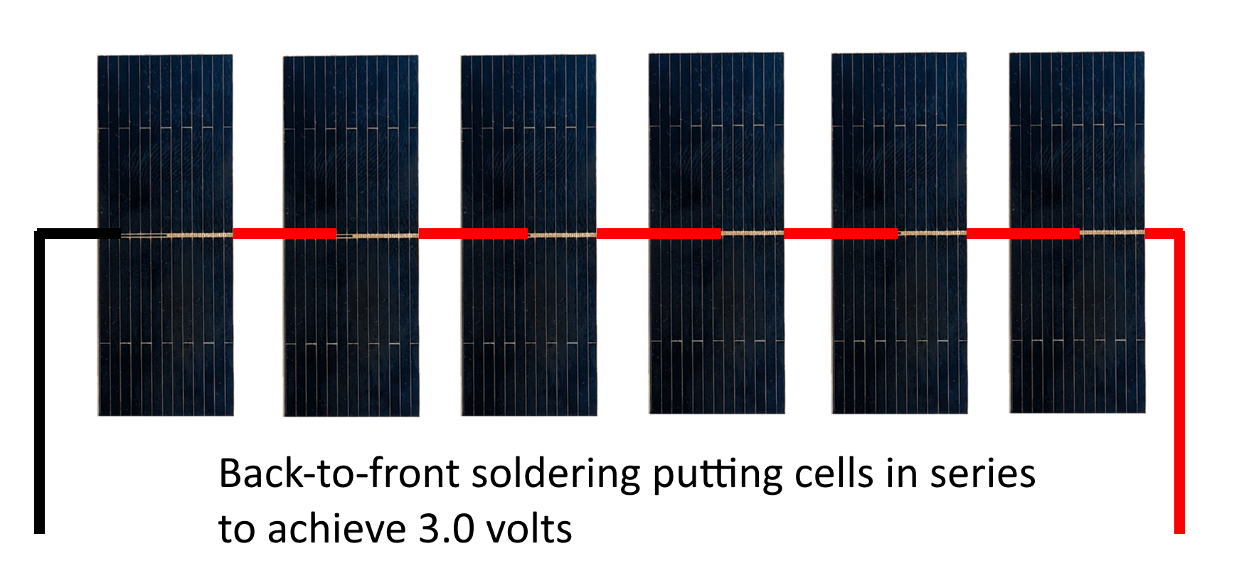 That means soldering the cells in series (front to back), just as you would combine batteries to achieve a higher voltage.