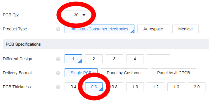 When ordering from JLCPCB (see link below), make sure for these PCBs (unlike the Jetpack) that you choose a quantity no higher than 30, and a 0.6mm thickness.