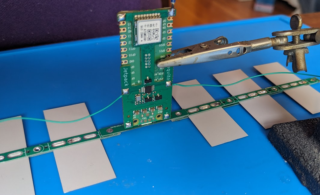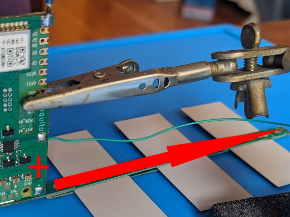 - Lay down a 3-cell jig PCB on top of the one cell, in the left-most slot, arrows facing right