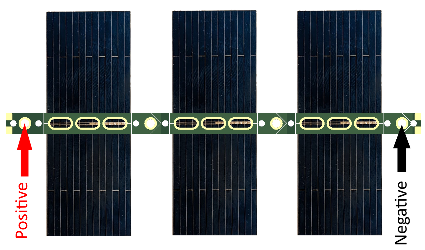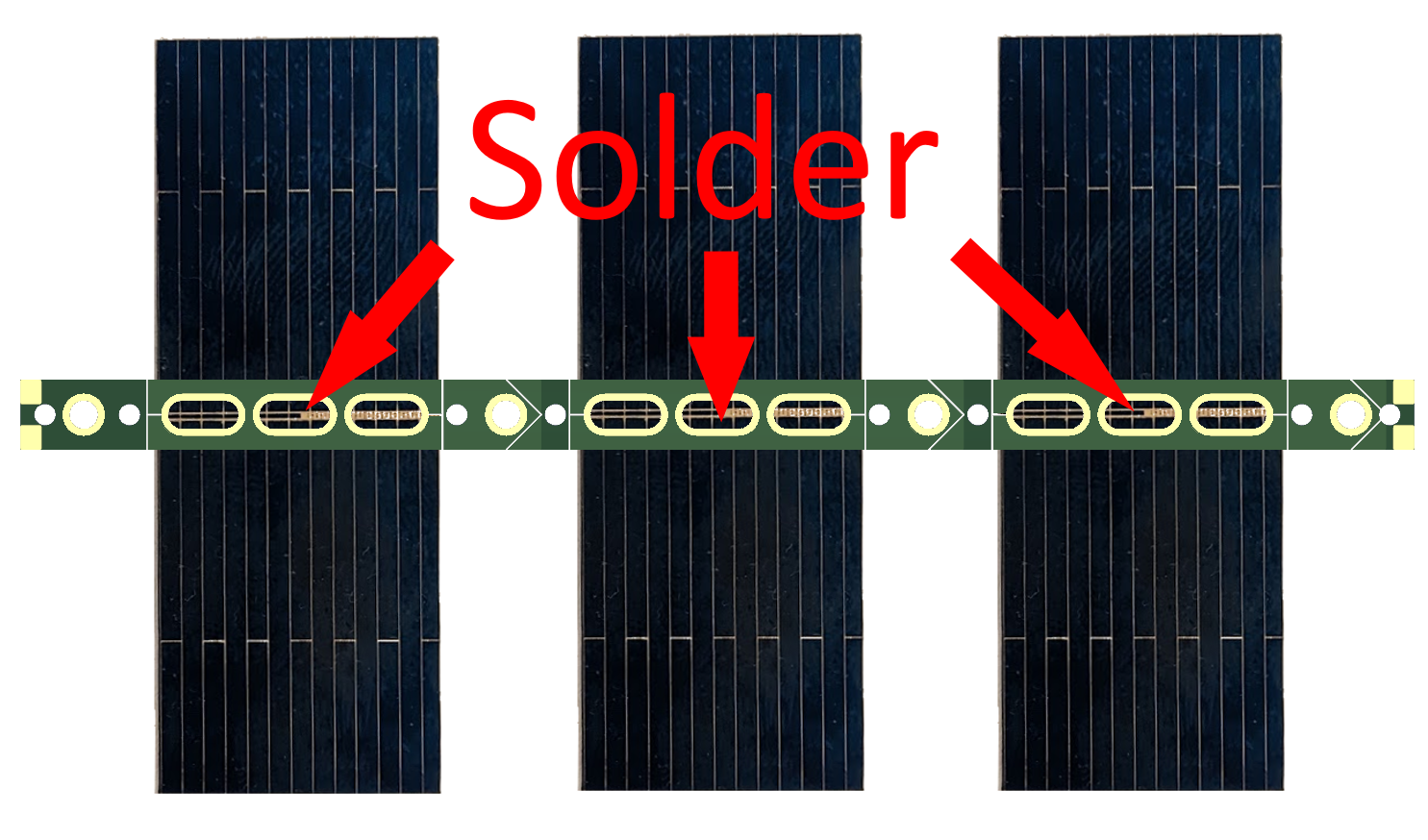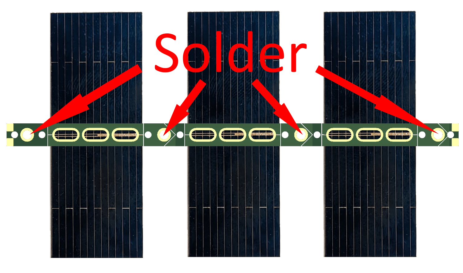 When you solder one PCB on the top of the solar cells, another PCB on the bottom, the internal circuitry of the PCB will combine the cells and make a complete panel.