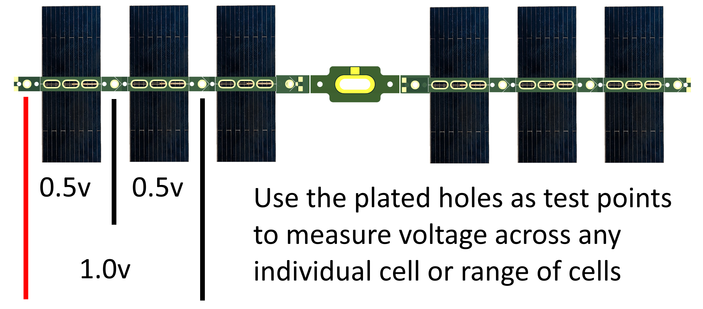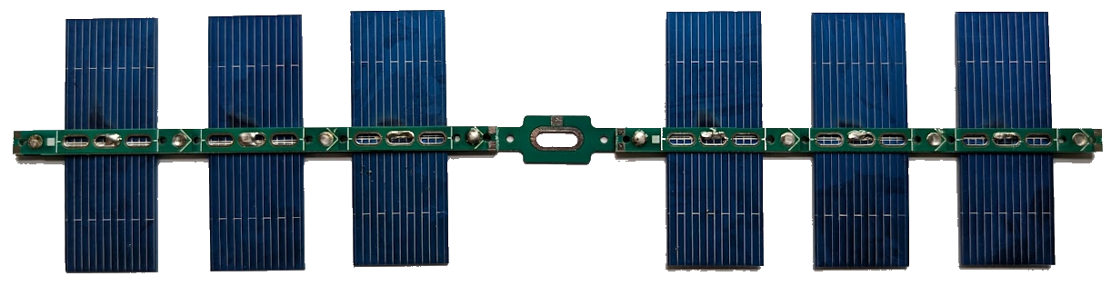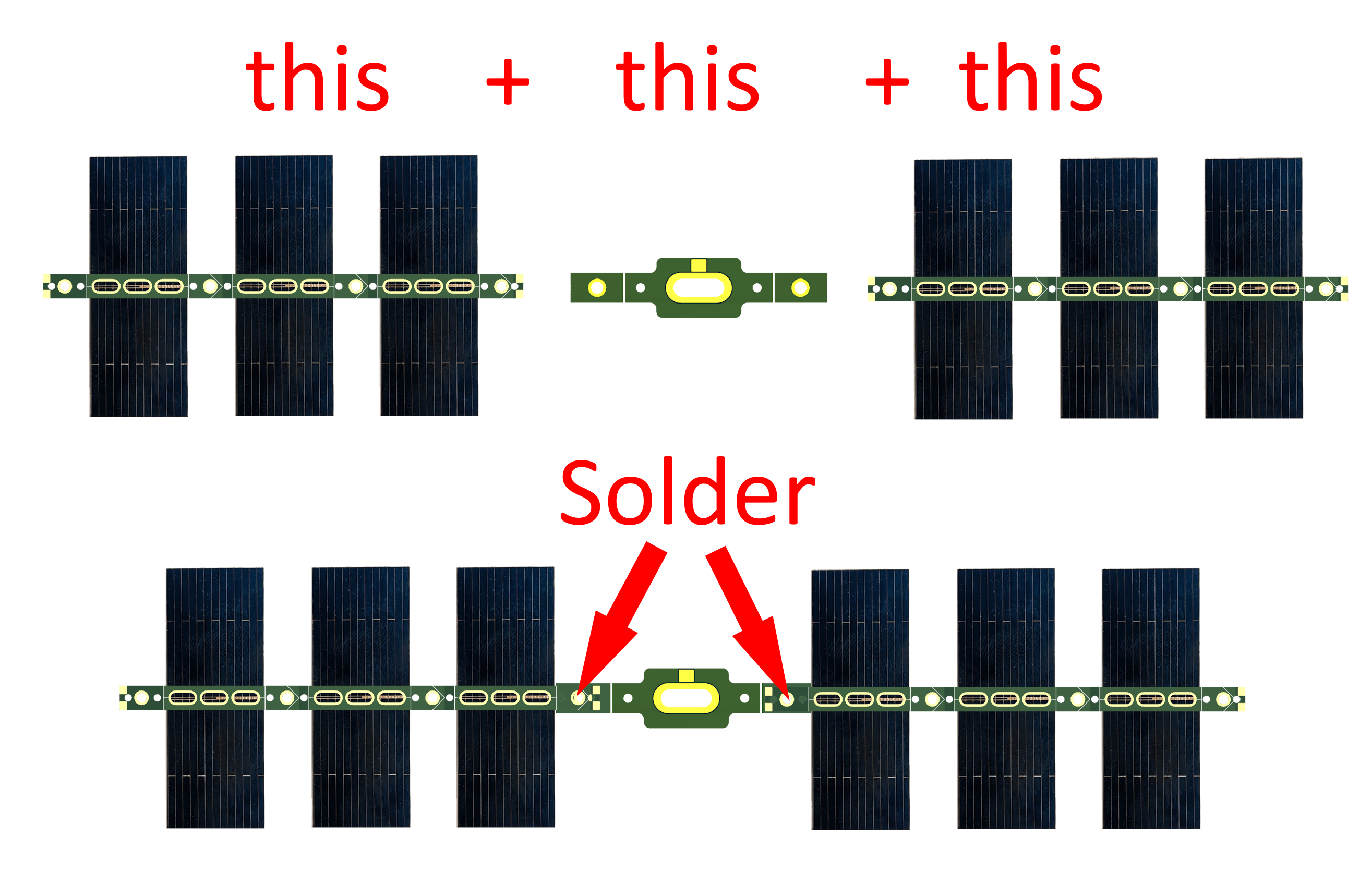 When you solder one PCB on the top of the solar cells, another PCB on the bottom, the internal circuitry of the PCB will combine the cells and make a complete panel.