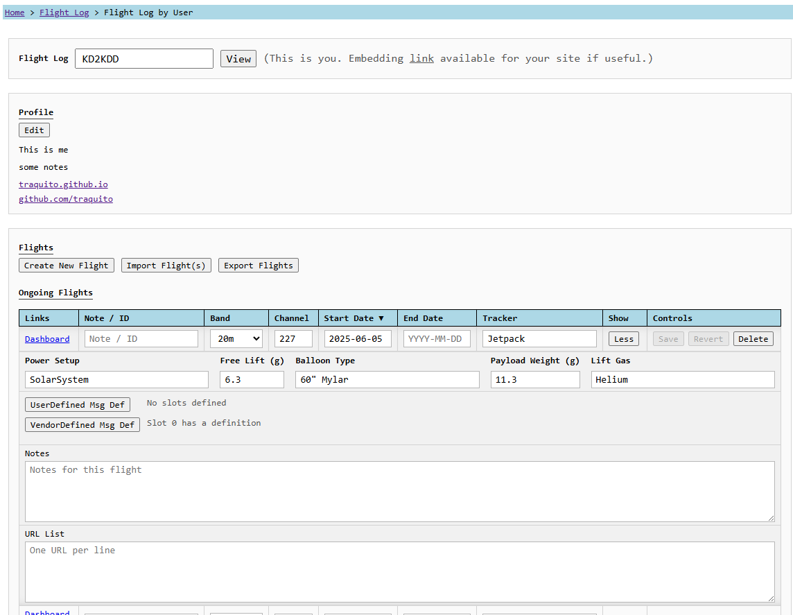 Click the link and your Flight Log page will open a new entry pre-filled with tracker-configuration details including UserDefined message defs.